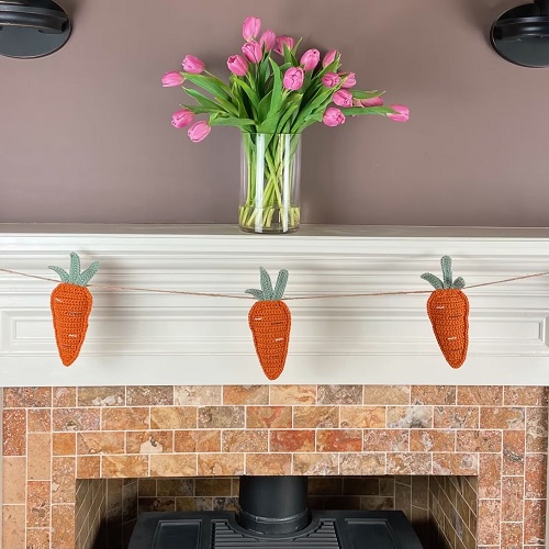 This crochet carrot garland by Nikki is super easy and beginner friendly. Each one is 9 x 3 inches, stitched in a 2D style with two flat panels, joined and lightly stuffed.